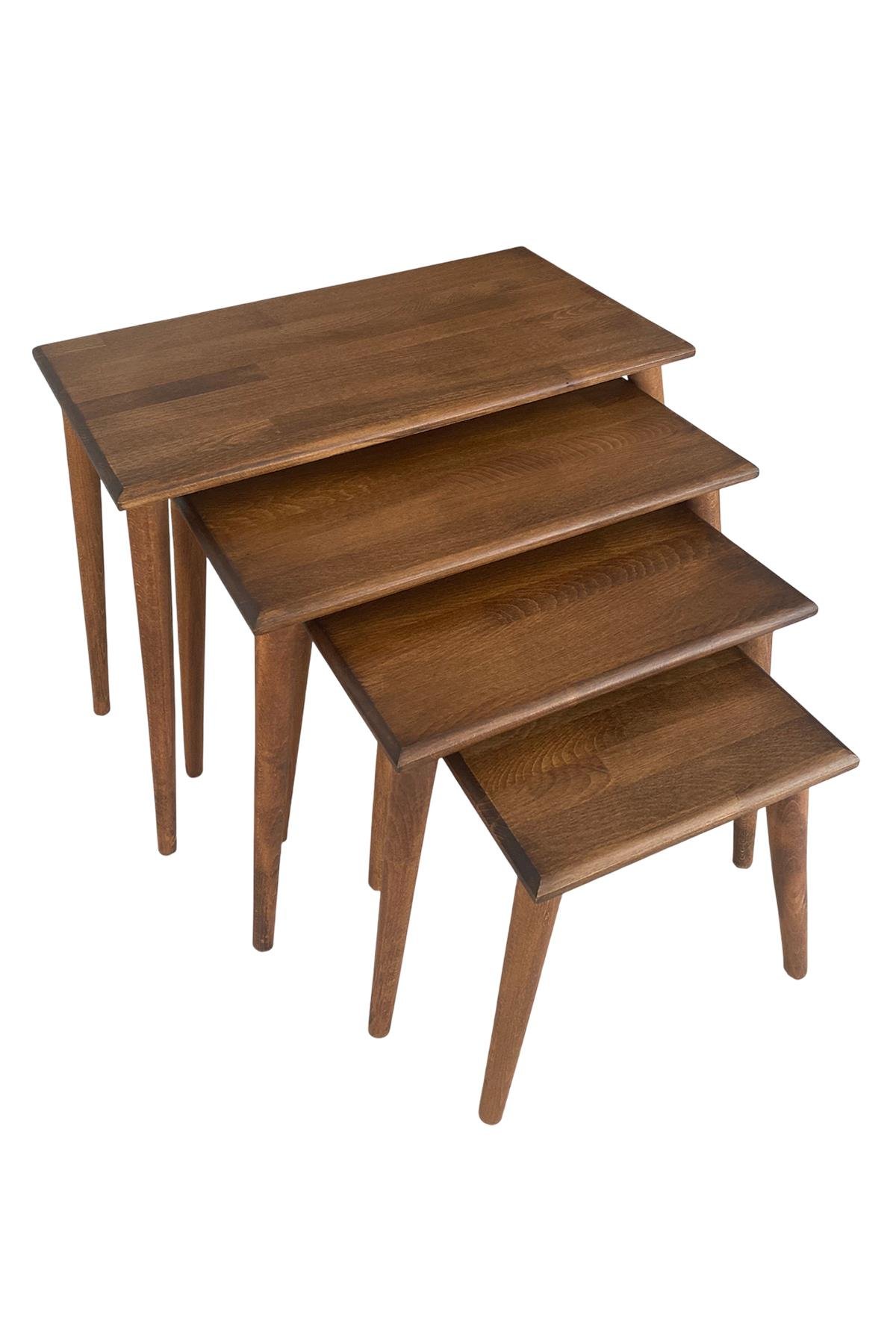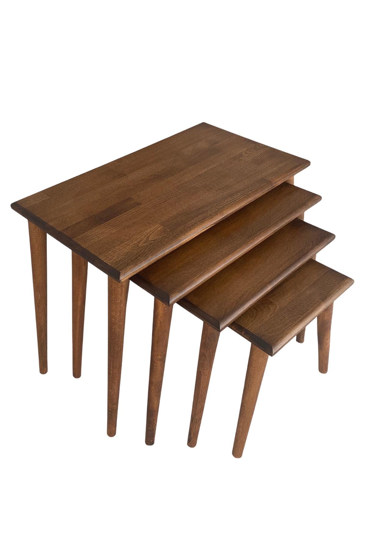Her biri farklı boyutlarda olan dört adet sehpa, pratik kullanım ve yer tasarrufu sağlayacak şekilde iç içe geçebilen bir yapıya sahiptir.