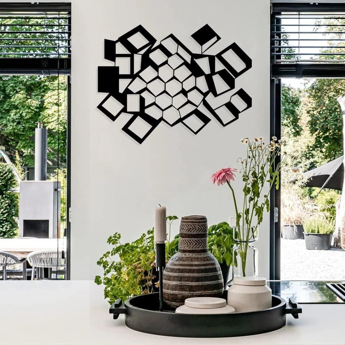 Modern Estetik: Metal Duvar Sanatı, eviniz, ofisiniz, yatak odanız veya oturma odanıza modern ve sofistike bir dokunuş katan şık, siyah geometrik bir tasarıma sahiptir.